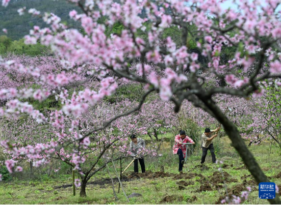 村民在灌阳县水车镇官庄村水车桃园劳作